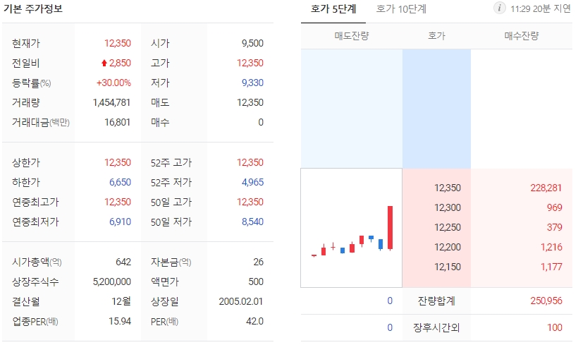 30일 오전 10시 34분 기준 한창산업은 2550원(26.84%) 오른 1만 2150원에 거래되고 있습니다.