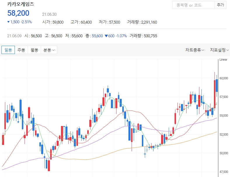 카카오게임즈는 새로 서비스를 시작한 오딘의 흥행과 중국 판호 개방에 대한 기대감이 더해지며 전날 증시에서 8.35%(4600원) 오른 5만9700원으로 장을 마감했으며 30일 오후 12시 기준 -2.68% 하락한 58,100원으로 보합세를 유지하고 있습니다.