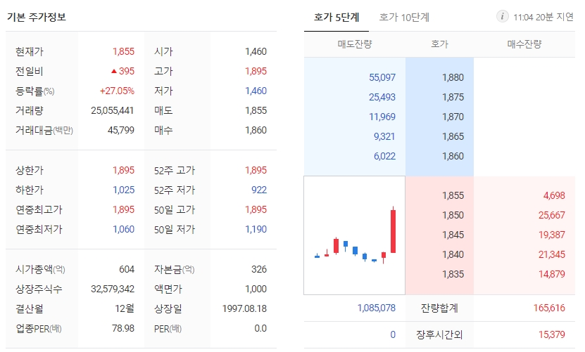 11시 04분 기준 +27.40 상승한 1,860원에 머물고 있습니다. 추세선으로 보면 현재 단기·중기 이평선이 정배열 상태로 상승세를 보이고 있습니다.