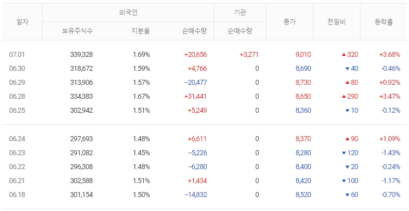 같은 기간 개인의 거래비중이 92.4%로 가장 높아, 주요 거래 주체로 참여했음을 알 수 있습니다. 더욱이 전일 외국인이 대량 순매수를 하고 있어 투자자들의 관심이 집중되고 있다.