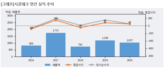 시공테크는 2020년 매출액 1037억원과 영업이익 48억원을 기록했습니다. 전년대비 매출은 -13.4%, 영업이익은 -39.7% 각각 하락했으며 회사의 매출액 증감률과 영업이익 증감률은 각각 코스닥 하위 26%, 하위 33%에 해당됩니다.