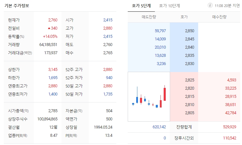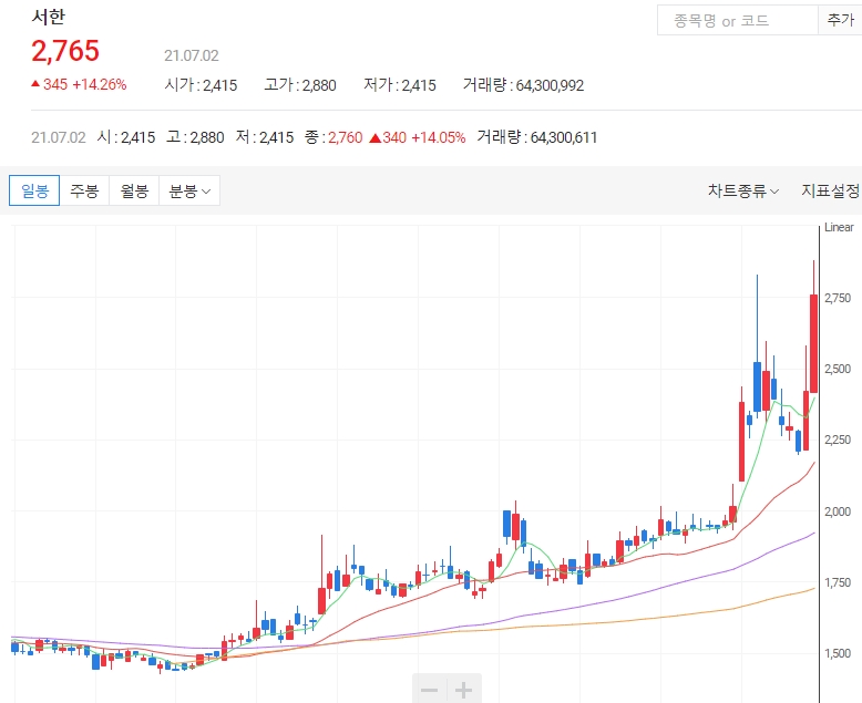 서한 주가의 흐름을 살펴보면 2,415원으로 개장해서 장중 한때 2,880원(+19.01%)까지 큰폭으로 상승했다가 소폭 조정을 받아 현재 2,865원(+18.39%)에서 머물고 있습니다.