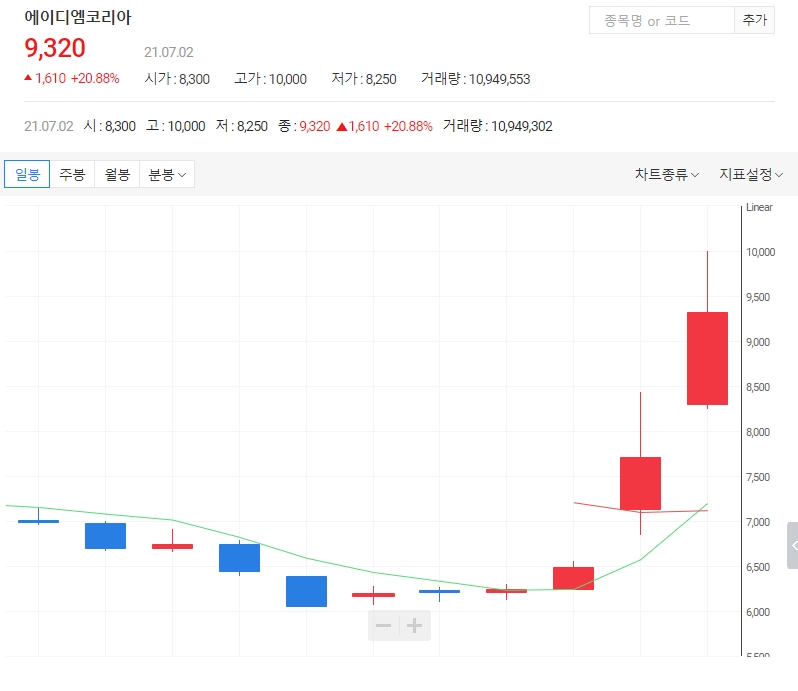 전날에도 에이디엠코리아는 18.8% 상승 마감했습니다. 2일 오전 9시 14분 현재 에이디엠코리아는 전일 대비 1200원(15.56%) 오른 8910원에 거래되고 있습니다.