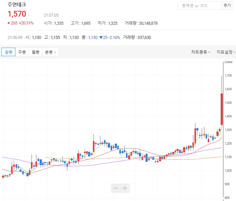 주가의 흐름을 살펴보면 1,335원으로 개장해서 장중 한때 1,325원(+1,53%)까지 밀렸다가 다시 1,695원(+24,14%)까지 상승 반전한 후 현재는 1,620원(+24.14%)에서 머물면서 장중에 많이 상승한 모습입니다.