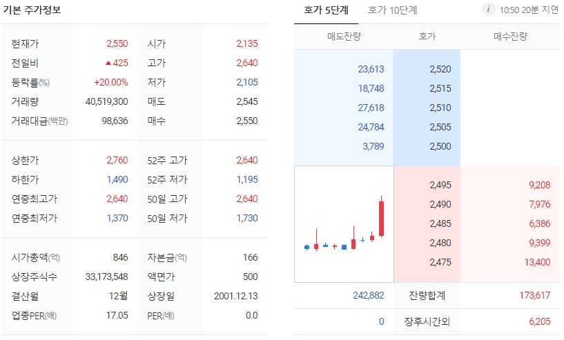 엑사이엔씨는 전일보다 17.88%(380원) 오른 2505원에 거래되며 시간이 지날수록 가파른 상승세를 보이고 있습니다.