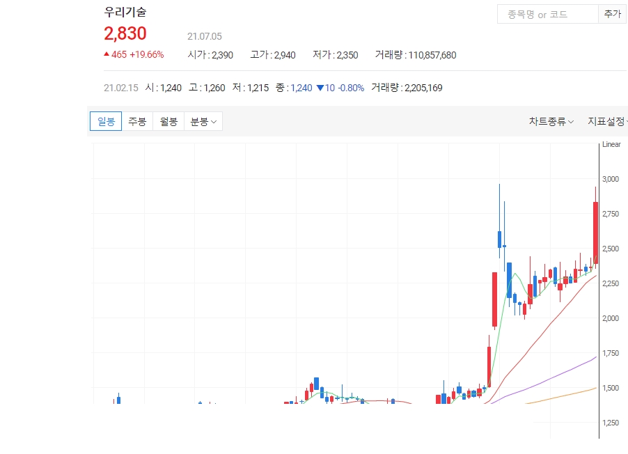 우리기술은 5일 코스닥 시장에서 낮 12시6분 현재 전 거래일보다 12.9%(305원) 상승한 2670원에 거래되고 있다. 우리기술은 낮부터 가파른 상승세다.