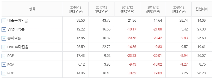 연간 당기순이익은 2020년도 기준으로 -14억원 손실을 보면서 적자를 기록했는데 전년도에 기록한 -98억원 손실에 비하면 적자 폭을 크게 줄인 모습입니다.