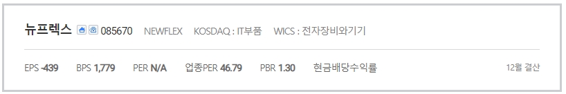 뉴프렉스는 장중 2945원까지 오르면서 52주 신고가를 경신했습니다. 당기순이익 적자로 인해 이 종목의 PER는 마이너스이고, PBR은 1.1배이며 PER는 마이너스라서 IT부품업종의 평균 PER -5.4배와 동일한 수준입니다.