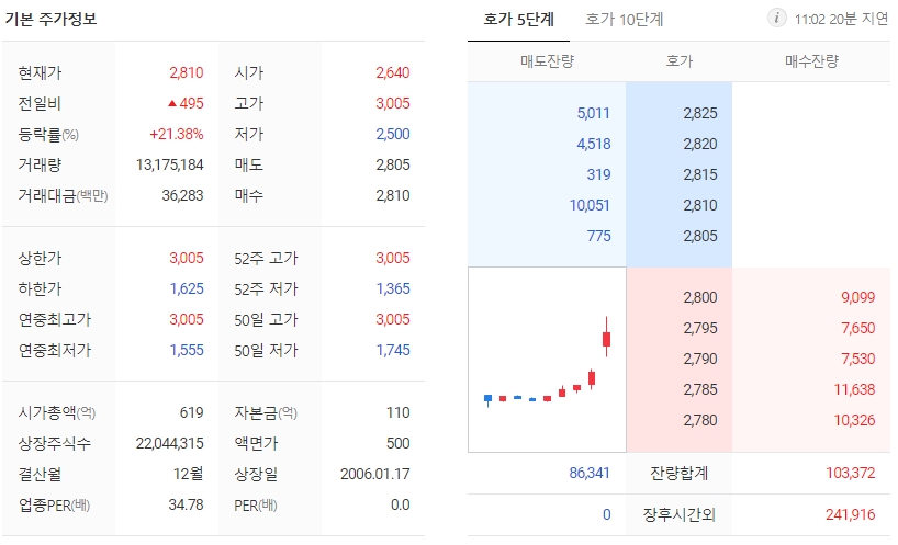 뉴프렉스는 장중 2945원까지 오르면서 52주 신고가를 경신했습니다. 당기순이익 적자로 인해 이 종목의 PER는 마이너스이고, PBR은 1.1배이며 PER는 마이너스라서 IT부품업종의 평균 PER -5.4배와 동일한 수준입니다.