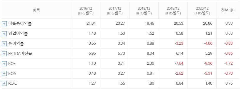 2019년에는 2018년 대비 매출실적이 약 87억 원이 감소했습니다. 2020년은 2019년 대비 약 5억 원이 감소했습니다. 즉, 매출실적은 계속 감소세이나 영업이익은 2019년보다 3억 원 소폭 증가했습니다. 당기순이익은 5억 원이 감소하여 25억 원 적자를 기록했습니다.