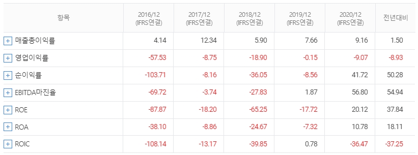 우리들휴브레인의 2020년 매출액은 전년대비 -52.1% 줄어든 269억원이고, 영업이익은 전년에 이어 적자가 지속되어 -24억원을 기록했습니다. 이 회사의 매출액 증감률과 영업이익 증감률은 각각 코스피 하위 3%, 하위 1%에 해당됩니다.