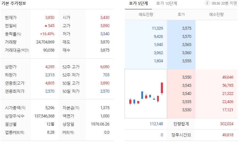 삼부토건은 오전부터 가파른 상승세입니다. 12일 삼부토건은 오전 9시19분 현재 전 거래일 대비 270원(8.17%)상승한 3575원에 거래되고 있습니다.