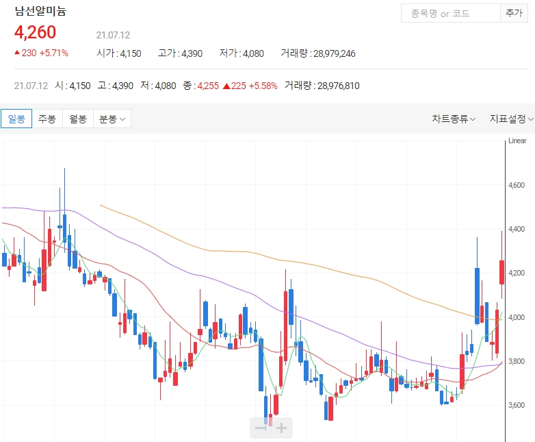 남선알미늄은 12일 코스닥 시장에서 오후 1시27분 현재 전 거래일보다 4.84%(195원) 상승한 4225원에 거래되고 있습니다. 남선알미우는 전 거래일보다 18.21%(7750원) 오른 5만300원에 거래되고 있으며 낮부터 급등 중입니다.