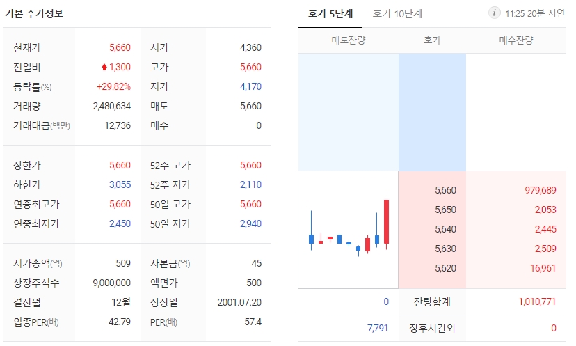 디지아이는 14일 10시 3분에 상한가에 진입하여 10시 30분 현재도 상한가를 유지하고 있습니다. 디지아이는 전일대비 1300원(29.82%) 상승한 5660원에 거래되고 있습니다.  디지아이는 12일을 제외하고 7일부터 13일까지 5% 미만의 낙폭을 나타냈습니다.
