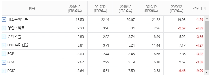 최근 3년간의 실적을 살펴보면, 매출액은 3년 연속 하락하고 있고 그 하락폭이 확대되고 있어서 투자자들은 주의깊게 살펴볼 필요가 있습니다.