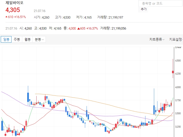16일 오전 9시 3분 기준 제일바이오는 16.24% 오른 4295원에, 거래되고 있습니다. 이날 거래량은 전일 대비 256.7% 급증하면서 최근 5거래일 거래량의 최고치를 넘어섰습니다.