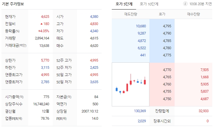 20일 오전 9시 49분 현재 전날보다 6.86% 오른 4750원에 거래되고 있으며 이날 거래량이 전일 대비 209.6% 급증하면서 주가도 동반 상승하고 있습니다. 거래원 동향은 NH투자, 미래에셋 등이 매수 상위 목록에 나타나고 있습니다.