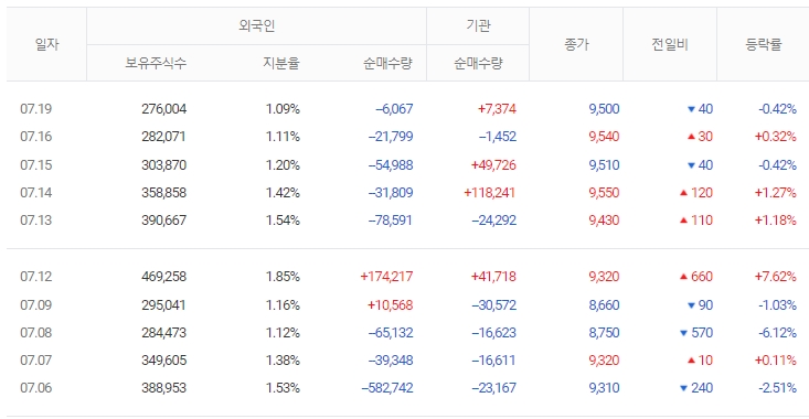 20일 오전 9시 50분 현재 전날보다 7.37% 오른 1만 200원에 거래되고 있습니다. 이날 거래량은 전일 대비 200.7% 급증하면서 최근 5거래일 거래량의 최고치를 넘어섰습니다.