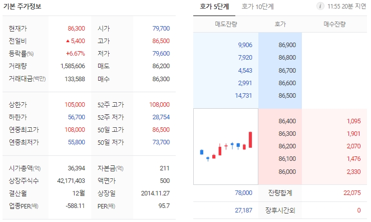 20일 오전 11시 26분 현재 전날보다 5.81% 오른 8만 5600원에 거래되고 있으며 이날 거래량이 전일 대비 202.0% 급증하면서 주가도 동반 상승하고 있습니다.