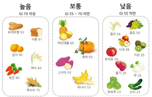 GI지수의 기준은 낮은 식품(~55), 보통 식품(56~69), 높은 식품(70~) 등 3가지로 나뉩니다.