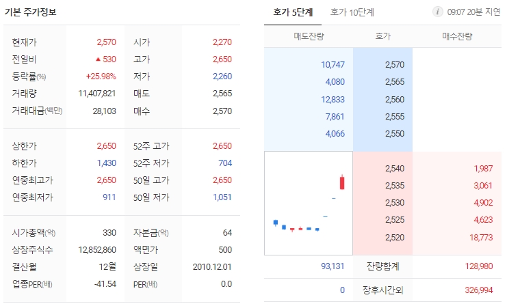 에이루트는 전 거래일 대비 470원(29.94%) 오른 2040원에 거래를 마쳤습니다. 52주 최고가를 기록했으며 거래량은 2,653,754주, 거래대금은 54억1400만원입니다. 전날에도 에이루트는 29.75%로 마감하며 상한가를 기록해 2거래일 연속 가격상한선까지 주가가 올랐으며 21일에도 상승세를 유지하고 있습니다.
