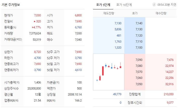 21일 오전 9시 37분 현재 전날보다 5.51% 오른 7080원에 거래되고 있습니다. 이날 거래량이 전일 대비 201.3% 급증하면서 주가도 동반 상승하고 있습니다.