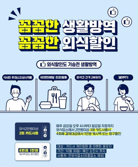 신종 코로나바이러스 감염증(코로나19) 재확산으로 중단됐던 정부의 외식산업 지원이 다시 시작됩니다. 외식 지원 요건등이 변경되었는데 자세한 내용을 확인하시고 이용하시기 바랍니다.