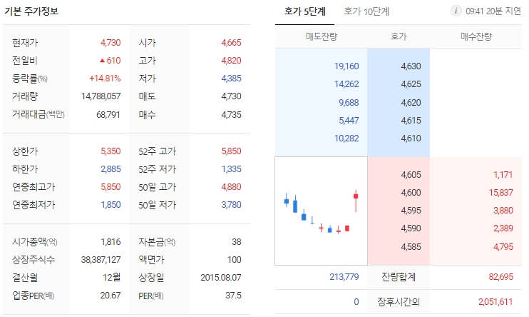 26일 오전 9시 6분 현재 전날보다 12.62% 오른 4640원에 거래되고 있습니다. 이날 거래량은 전일 대비 226.6% 급증하면서 최근 5거래일 거래량의 최고치를 넘어섰습니다.