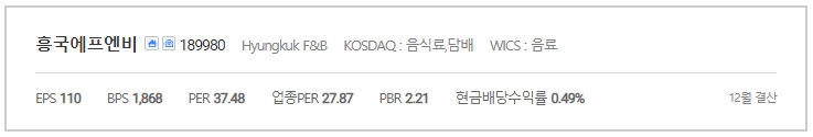 식음료 ODM 제조업체인 흥국에프엔비 주가가 강세를 보이고 있습니다. 26일 오전 9시 6분 현재 전날보다 12.62% 오른 4640원에 거래되고 있습니다. 오늘은 흥국에프엔비 주가 전망에 대해 알아보겠습니다.