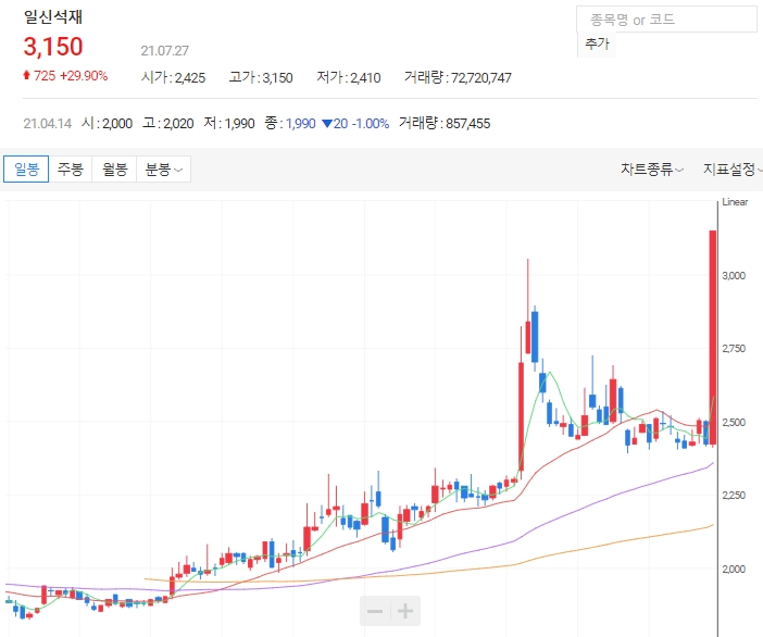 일신석재 주가가 오르고 있다. 27일 한국거래소에 따르면 일신석재는 이날 오전 10시 22분 기준 전 거래일 대비 245원 (10.10%) 오른 2670원에 거래 중이다.