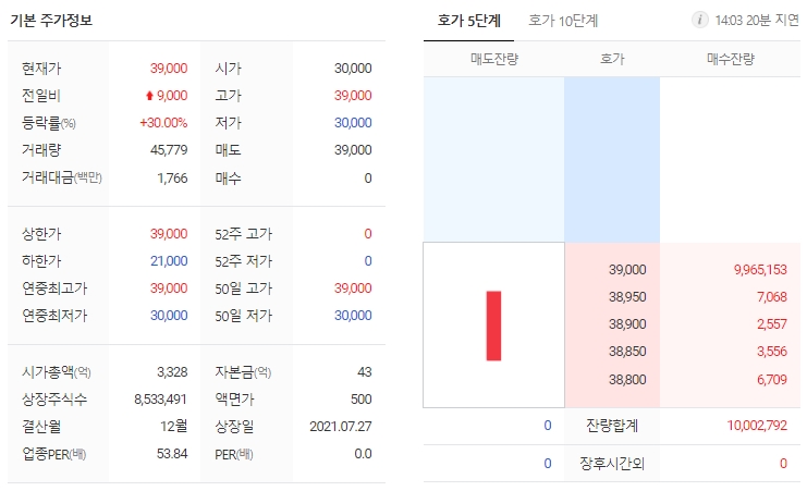 이날 한국거래소에 따르면 맥스트는 공모가(1만5000원)의 두배 가격으로 시초가 3만원을 형성한 후 장을 개시, 오후 1시 기준 가격제한폭(30.00%)까지 오른 3만9000원을 유지하고 있다.