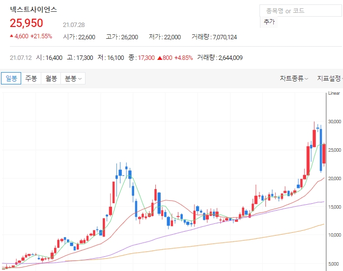 넥스트사이언스의 주가가 롤러코스터를 타고 있습니다. 27일 장 마감 기준 넥스트사이언스 주가는 전 거래일 대비 7400원 가량 밀리며 하한가에 근접한 반면 28일 장 초반에는 3900원 상승하며 18.27%의 상승률을 보이고 있습니다.