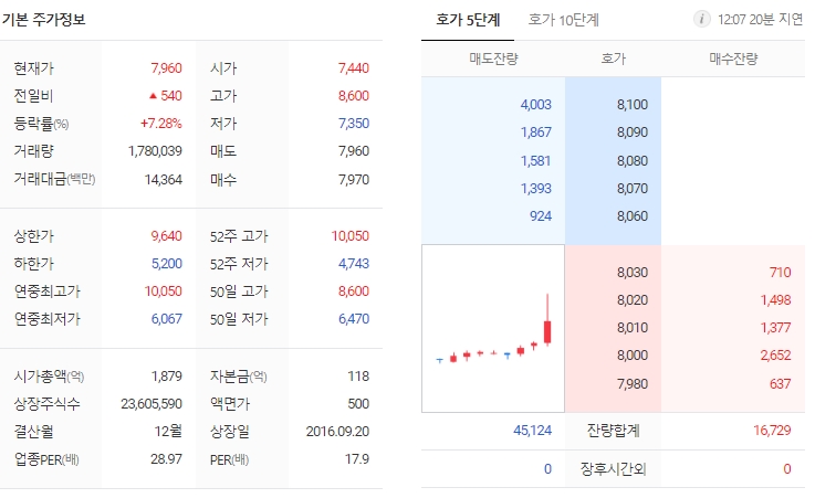 28일 오전 11시 59분 현재 전날보다 8.36% 오른 8040원에 거래되고 있습니다. 이날 거래량은 전일 대비 206.0% 급증하면서 최근 5거래일 거래량의 최고치를 넘어섰습니다. 차트상 주가의 흐름은 현재 단기·중기 이평선이 정배열 상태로 전형적인 상승세를 보이고 있습니다.