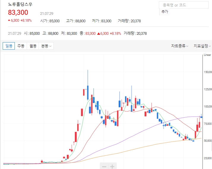 노루홀딩스우 주가가 상승중이다. 노루홀딩스우는 29일 10시 36분 기준 전일보다 +8.18%오른 83,300원에 거래되고 있다. 노루홀딩스우의 주가 전망과 주가 상승의 이유데 대해 알아보도록 하겠다.