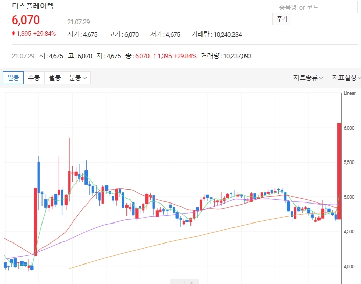 디스플레이텍이 29일 오전 11시 27분 현재 전날보다 29.84% 오른 6070원에 거래되고 있다. 이날 거래량은 전일 대비 급증하면서 최근 5거래일 거래량의 최고치를 넘어섰다.