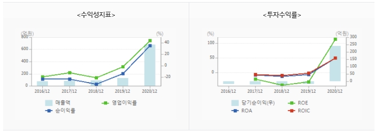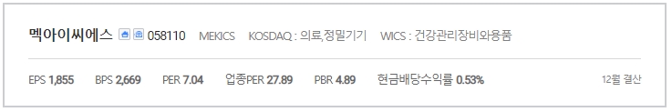멕아이씨에스의 2020년 매출액은 680억으로 전년대비 429.2% 상승했고, 영업이익은 304억으로 흑자전환했다. 이 회사의 매출액 증감률과 영업이익 증감률은 각각 코스닥 상위 2%, 상위 1%에 해당된다.