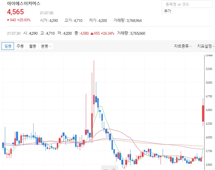 아이에스이커머스가 급등 중이다. 아이에스이커머스는 30일 오전 9시 30분 기준 전날보다 1005원(27.72%) 오른 4630원에 거래되고 있다. 온르은 아이에스이커머스 주가 상승이유에 대해 알아보자.