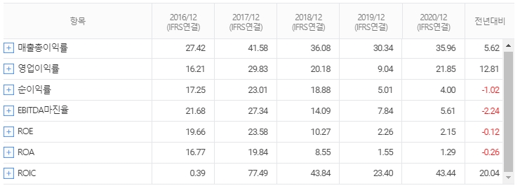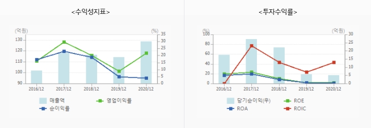 최근 실적을 살펴보면 2020년 매출액이 최근 5년 중 가장 높은 실적을 기록했음을 알 수 있다. 이전 최고 실적이었던 2017년 보다도 9.2%(10억 9천만원) 늘어난 것으로 나타났다.