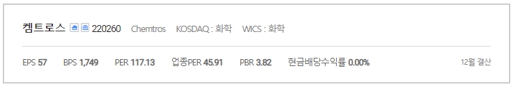 켐트로스 시가총액은 2010억원이며, 시총순위는 코스닥 567위다. 액면가는 1주당 100원이다.