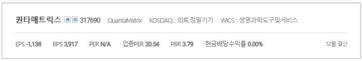 퀀타매트릭스는 혈액, 분뇨, 체액 등 인체 내부에서 채취된 대상물을 이용하는 체외진단의료기기를 국내외 상급종합병원 및 검사수탁기관을 대상으로 연구개발, 생산, 판매하는 사업을 영위하며 2020년 12월 9일 코스닥 시장에 신규상장했다.