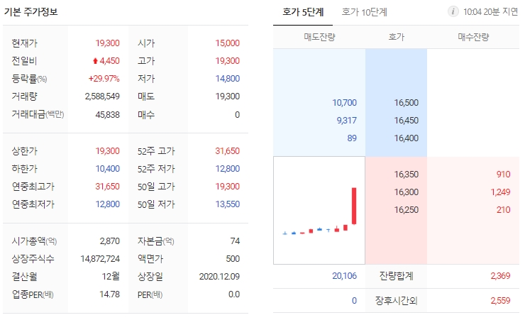 퀀타매트릭스는 30일 오전 10시24분 현재 전 거래일보다 29.97%(4450원) 상승한 1만9300원에 거래되고 있다. 퀀타매트릭스는 26일을 제외하고 22일부터 29일까지 4% 미만의 상승폭을 나타냈다.