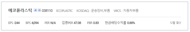 에코플라스틱은 자동차용 플라스틱 부품 생산업체로 과거 기아 애플 카 생산설 풍문에 상승을 많이 한 종목으로 이재명 정치테마주 이슈뿐만 아니라 전기차 관련 이슈로 주가에 영향을 미칠 것으로 보인다.
