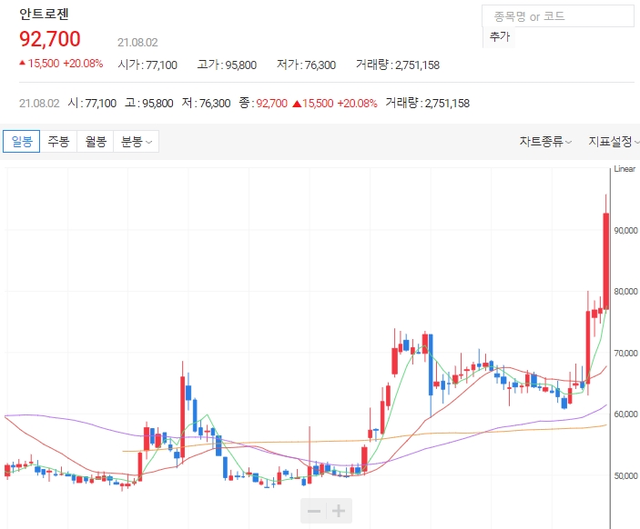 안트로젠 주가가 상승 중이다. 2일 오후 12시16분 기준 안트로젠 주가는 직전 거래일보다 14.25%(1만1천 원) 오른 8만8200원에 사고팔리고 있다. 안트로젠은 27일을 제외하고 23일부터 30일까지 20% 미만의 상승폭을 나타냈다.