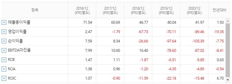 2021년 3월 전년동기 대비 별도기준 매출액은 64.3% 증가, 영업손실은 9.2% 감소, 당기순손실은 192.3% 증가했다.