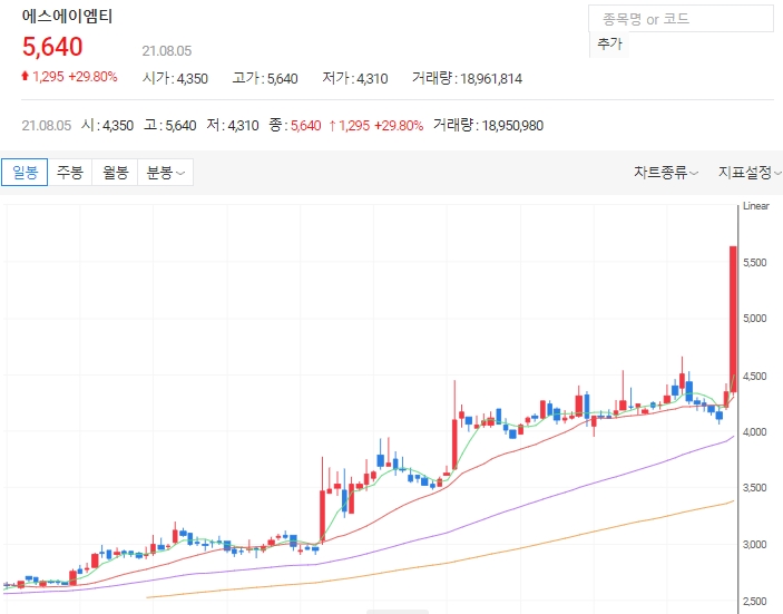 현재 에스에이엠티의 거래량은 최근 5거래일 거래량의 최고치를 경신하고 있습니다. 추세선으로 보면 현재 단기·중기 이평선이 정배열 상태로 전형적인 상승세를 보이고 있으며 종목의 차트에서 최근에 골든크로스 등을 확인할 수 있습니다.