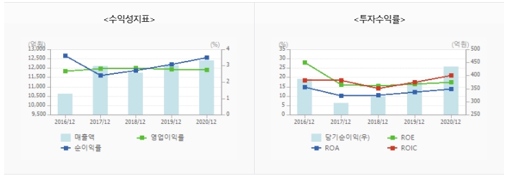 최근 실적을 살펴보면 2020년 매출액이 최근 5년 중 가장 높은 실적을 기록했음을 알 수 있습니다. 이전 최고 실적이었던 2019년 보다도 2.2%(266억 3천만원) 늘어난 것으로 나타났습니다.
