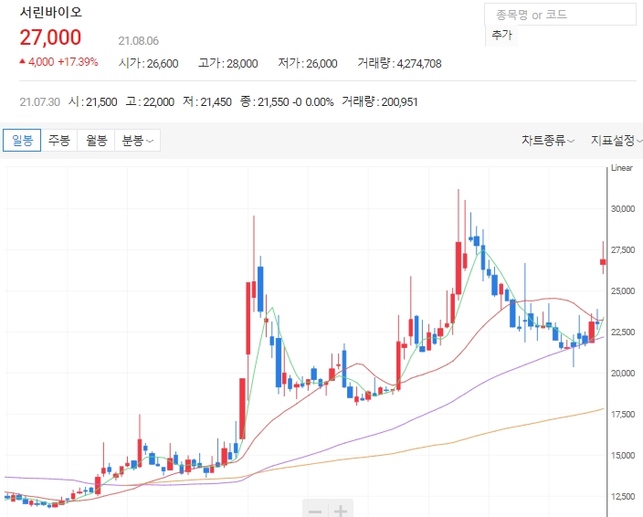 6일 한국거래소에 따르면 서린바이오는 오전 9시48분 기준 전날보다 3800원(16.52%) 오른 2만6800원을 가리키고 있습니다. 장 초반 한때 21% 넘게 올라 2만8000원 선을 넘보기도 했습니다.
