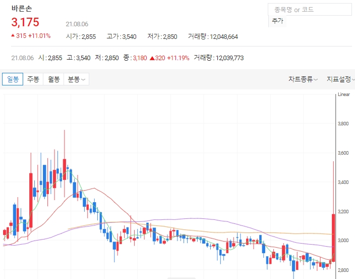 6일 주식시장에서 바른손 주가는 전일 대비 12.76% 오른 3225원, 에이비프로바이오는 전일 대비 6.14% 오른 1210원으로 급등세입니다. 또 바른손이앤에이 주가는 전일 대비 5.48% 오른 1540원 상승하고 있으며 바른손은 4일부터 이날까지 3거래일 연속 상승세입니다.