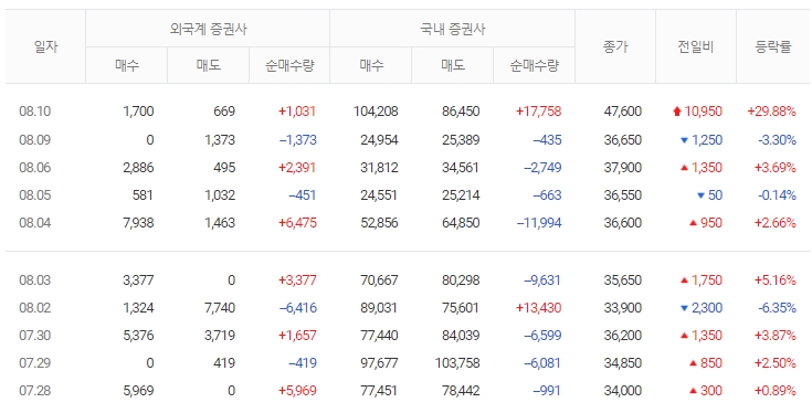 10일 오전 주식시장에서 푸드나무 주가는 전일 대비 29.88% 오른 4만7600원에 거래되고 있습니다. 52주 신고가 3만8000원을 경신했습니다.