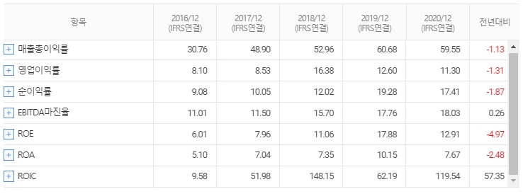 코데즈컴바인의 매출액은 2020년에는 전년 대비 소폭 감소했지만 5개년의 추세는 상승세를 보이고 있습니다. 순이익률 역시 2020년에는 소폭 감소했지만 5년 동안 증가하는 추세이고 이에 따라 당기순이익도 증가하고 있는 추세입니다.